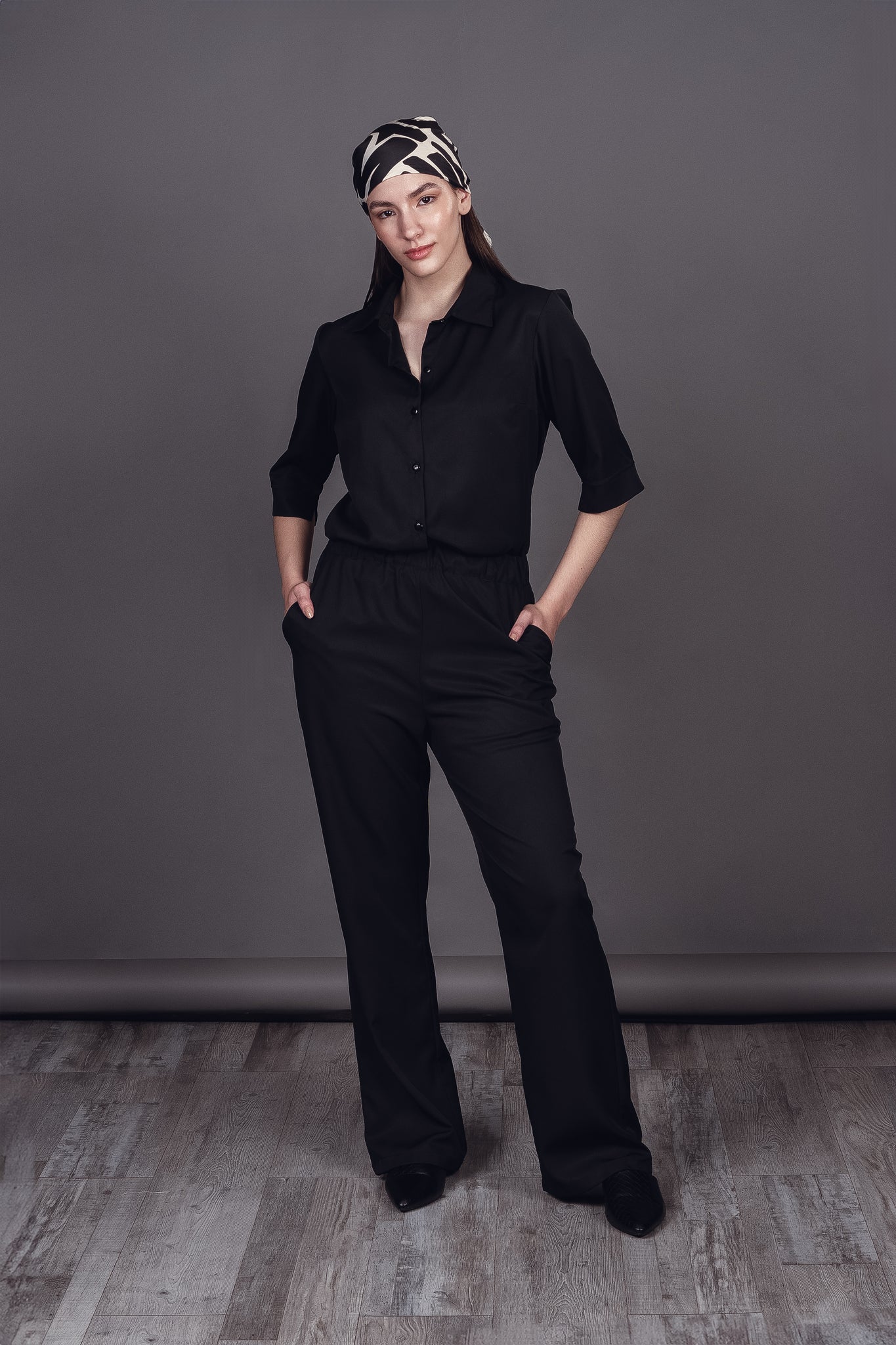 Enterito con cuello camisero, mangas tres cuartos, con elástico en cintura, bolsillos en costado y calce relajado. Fabricado en Tencel.