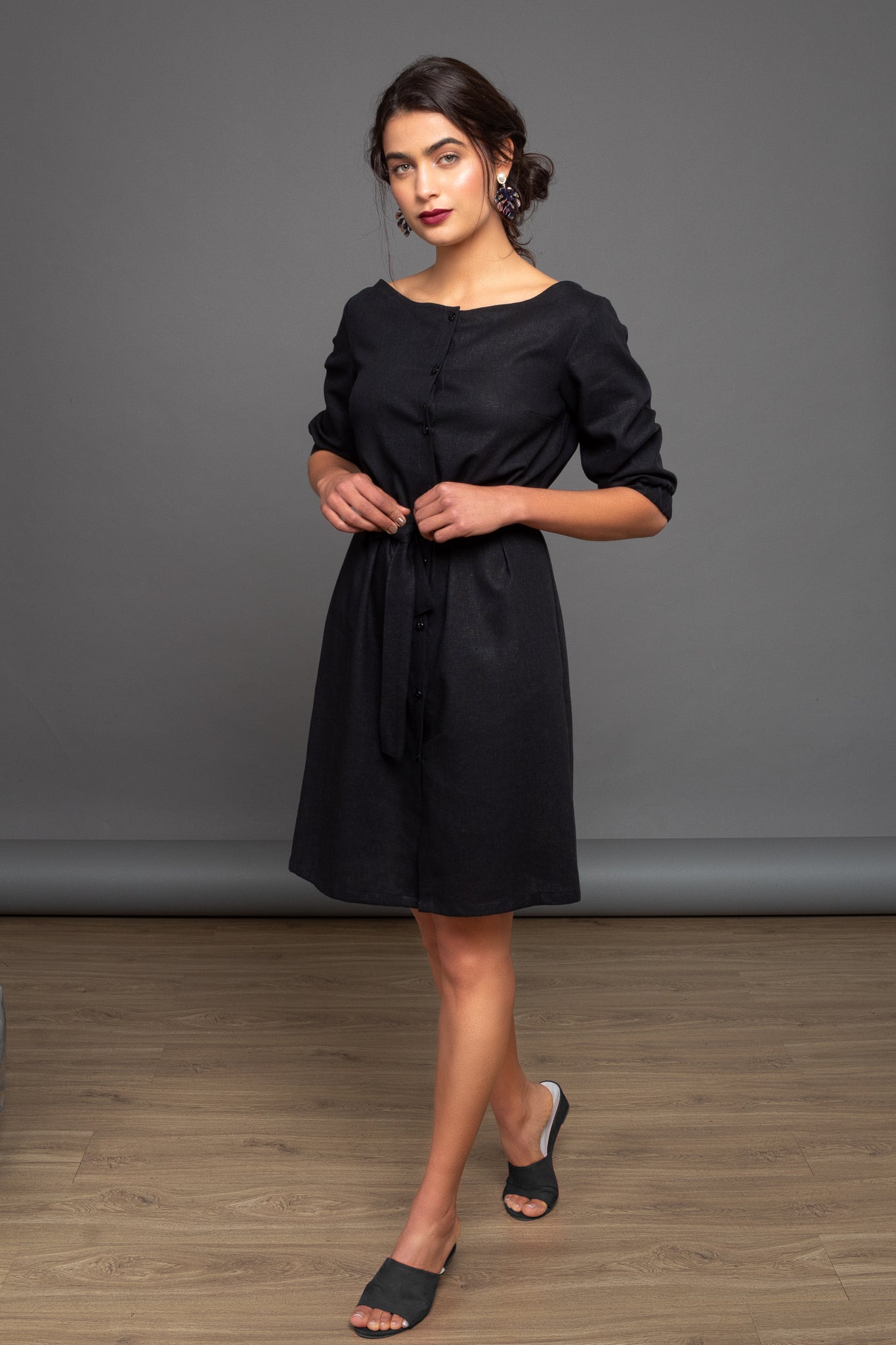 Vestido abotonado en delantero, escote bote, bolsillos en costado y un lazo que permite ajustar. Fabricado en linotto, tela que posee un alto porcentaje de lino.